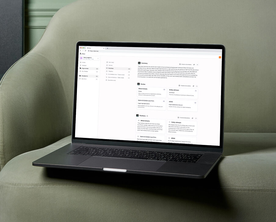 The future of legal work is about effective orchestration. Alice connects people, facts, documents, and principles in a verifiable flow. Each step strengthens the next, helping lawyers see the bigger picture while grounded in verified sources. Alice scales with your practice, from case intake to courtroom.