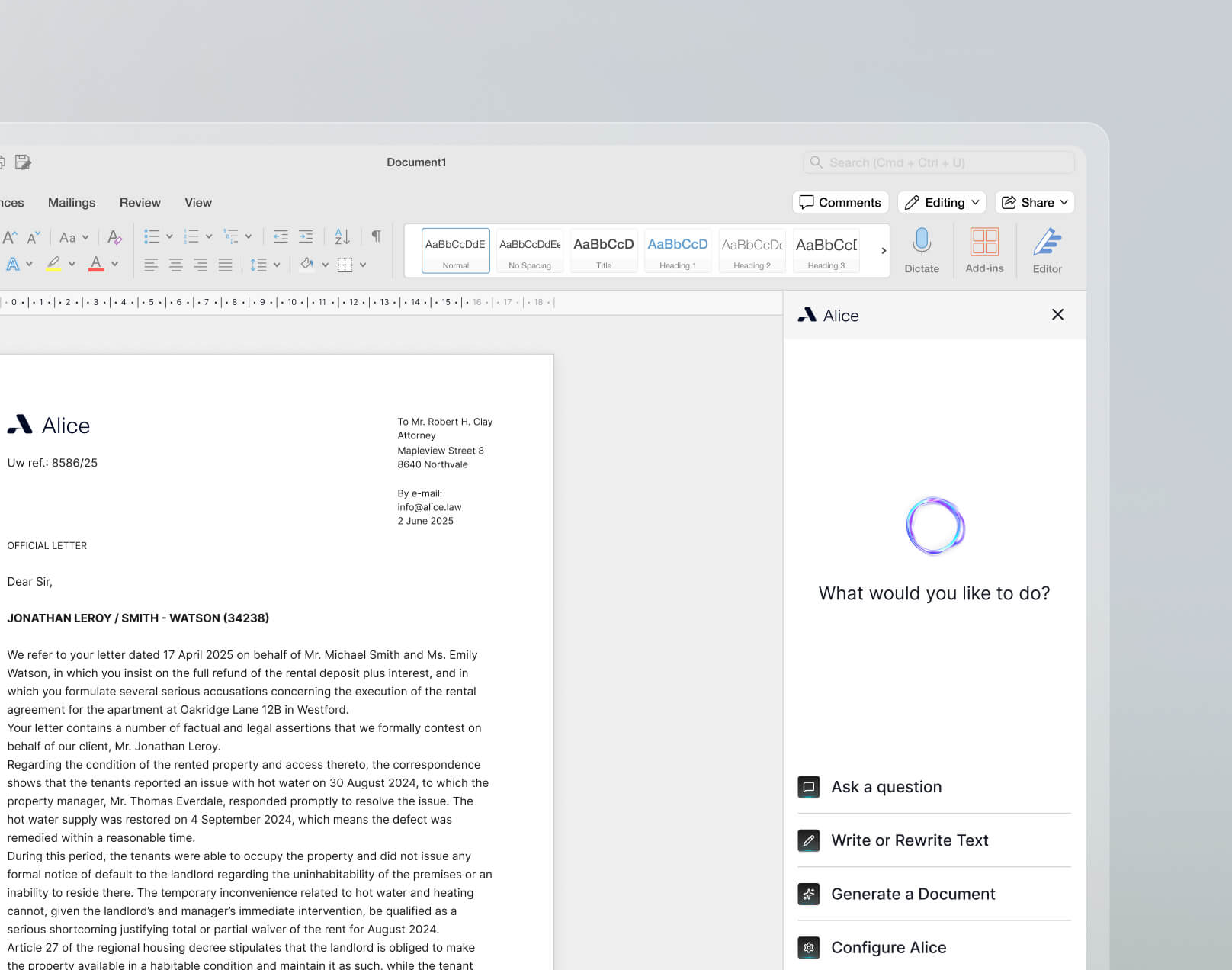 Every case ends in writing. Alice transforms insights into legal documents. You choose what to keep or rewrite, and Alice ensures it’s ready.