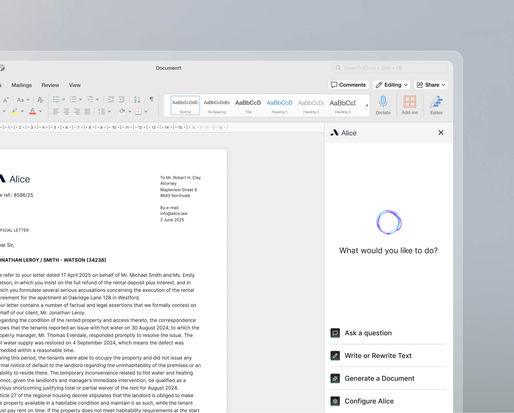 From there, refinement continues seamlessly in Word. Lawyers can adapt tone, add nuance, and finalize advocacy — while Alice ensures that structure, citations, and consistency remain intact.